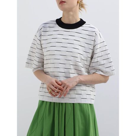 立体的なブロックチェック編のデザインが印象的なハーフスリーブニット。ゆったりとしたサイジングやスリーブに、コンパクトなクルーネックの対比がモードなバランスを保ちます。ハイゲージのきれいな表面感に美しい凹凸の構築的なデザインをプラスした1枚です。