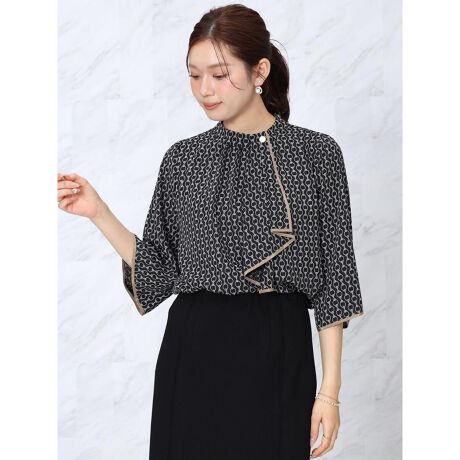 スカーフタイが映えるデザインで、女性らしい品格を漂わせるジオメトリック柄ブラウス。