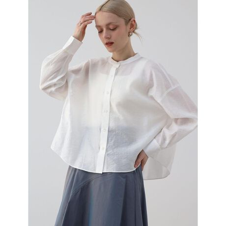 表面の微光沢がワンランク上の大人コーデに仕上げてくれるシャツブラウス。首元はすっきりとしたノーカラーで仕上げ、顔まわりをシャープに演出。肩線をやや落としたリラックス感のあるシルエットが体のラインを拾わず、自然と生まれる丸みが女性らしさをさりげなく引き立てます。ボトムスを選ばずシンプルながらもさりげない存在感を漂わせるアイテムです。