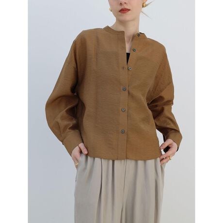 表面の微光沢がワンランク上の大人コーデに仕上げてくれるシャツブラウス。首元はすっきりとしたノーカラーで仕上げ、顔まわりをシャープに演出。肩線をやや落としたリラックス感のあるシルエットが体のラインを拾わず、自然と生まれる丸みが女性らしさをさりげなく引き立てます。ボトムスを選ばずシンプルながらもさりげない存在感を漂わせるアイテムです。