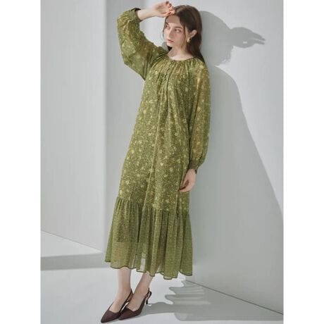 柔らかな透け感のある生地に、細やかな柄を全面にあしらった印象的な1着。