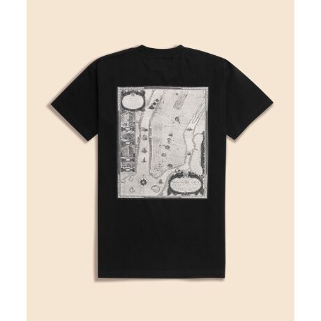 左胸には、クラシックな字体のブランドロゴ、背面にはアーカイブ資料に掲載されている図案をプリントしました。図案は、ブルックス ブラザーズのショップが湾岸から内陸へと移転していった足跡をたどる「マップ」と、当時の空気感を伝える「ポスター」の2種類。版を重ねてインクを載せていく、シルクスクリーンプリントを採用しており、その力強い発色と重厚な質感は、ブランドが歩んできた歴史の重みを描き出しているようにも感じられます。