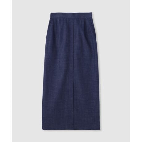 程よいストレッチの効いた、スラブ状に糸を使ってデニムライクな表情を出した生地で作成したペンシルシルエットのスカート。盛夏へ向けて分量感のあるブラウスなどが増えてくるため、組み合わせ易くシンプルに仕上げた万能スカート。
