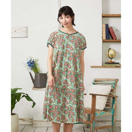 華やかな主役級ワンピースは一枚で華やかにきまります。一枚ではもちろん、カーディガンや細身のボトムスを合わせたレイヤードスタイルも◎。カットソー地なのでデイリー使いや旅行にもおすすめです。