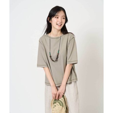 ジレやカーディガン、羽織との相性がよく、1枚でも重ね着でもコーディネートが決まります。着丈は程よいバランスで、パンツにもスカートにも合わせやすく、スタイリングの幅が広がります。ナチュラルでやさしい色合いは、手持ちの小物や靴とも自然に馴染みやすく、真綿のような軽やかさがデイリーに着たくなる一枚です。同素材のノースリーブカットソー[NGKGE41190]もございます。