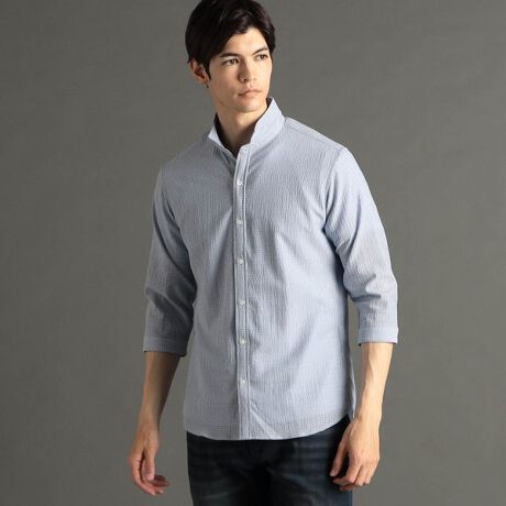 ミニマルなシャツカラーと、スタンドカラーに着こなせる2WAYデザイン。サファリシャツのデザイン性も備えたハイブリッドなスタイリングを演出。
