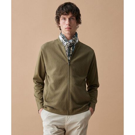 リンクス編みでヘリンボーン柄を立体的に仕上げたジップアップカーディガン。薄手で軽く、夏の冷房対策や軽い羽織として重宝する一着です。