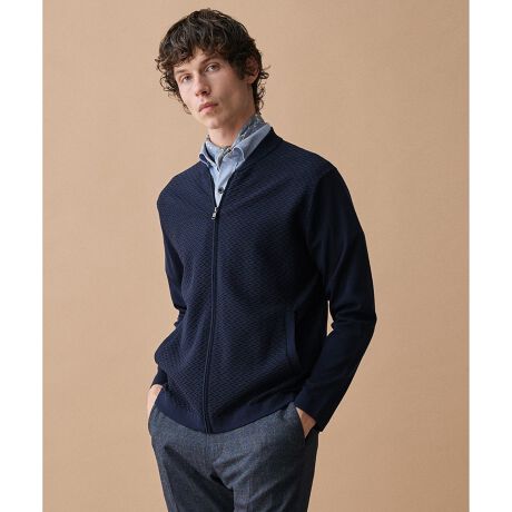 リンクス編みでヘリンボーン柄を立体的に仕上げたジップアップカーディガン。薄手で軽く、夏の冷房対策や軽い羽織として重宝する一着です。