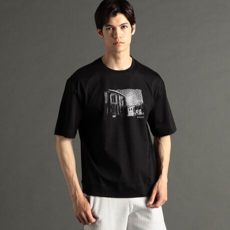 近未来を見据えたモノトーンの建築物が、コーディネートのアクセントとなるTシャツ。