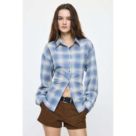 【FADE CHECK SHEER OVER SHIRT/フェードチェック シアーオーバーシャツ】■ポイント&ディテールカジュアルすぎない落ち感のある素材を使用したフェードチェックオーバーシャツ。軽やかで柔らかな風合いが、抜け感のあるスタイリングを演出します。バックスタイルにはレースアップデザインを施し、ウエストマークが可能。シルエットを調整することで、オーバーシャツとしても、メリハリのある女性らしいラインでも楽しめる2WAY仕様です。メンズすぎないチェックの配色もポイントで、都会的なヴィンテージスタイルを演出します。■スタイリングホルターネックのキャミソールやタンクトップの上からラフに羽織るのはもちろん、レースアップでウエストを絞ってトップス感覚で着用するのもおすすめ。デニムやカーゴパンツと合わせたカジュアルスタイルから、スラックスやミニボトムとのミックススタイルまで幅広く活躍します。