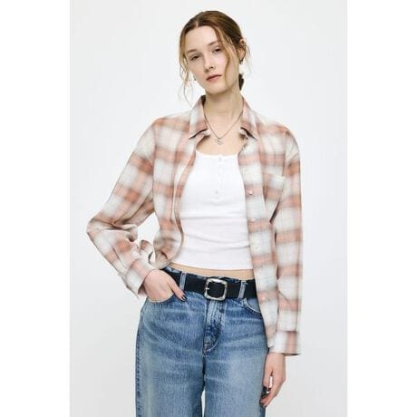 【FADE CHECK SHEER OVER SHIRT/フェードチェック シアーオーバーシャツ】■ポイント&ディテールカジュアルすぎない落ち感のある素材を使用したフェードチェックオーバーシャツ。軽やかで柔らかな風合いが、抜け感のあるスタイリングを演出します。バックスタイルにはレースアップデザインを施し、ウエストマークが可能。シルエットを調整することで、オーバーシャツとしても、メリハリのある女性らしいラインでも楽しめる2WAY仕様です。メンズすぎないチェックの配色もポイントで、都会的なヴィンテージスタイルを演出します。■スタイリングホルターネックのキャミソールやタンクトップの上からラフに羽織るのはもちろん、レースアップでウエストを絞ってトップス感覚で着用するのもおすすめ。デニムやカーゴパンツと合わせたカジュアルスタイルから、スラックスやミニボトムとのミックススタイルまで幅広く活躍します。