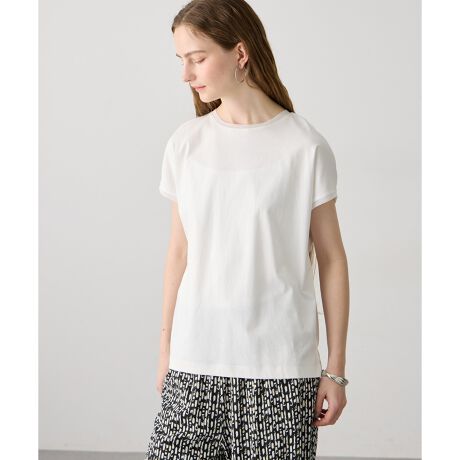 [型番:291198]さりげなく華やぐチュールT首元にあしらったチュールがポイントの上品なTシャツ。シンプルな中に女性らしさをプラスした、取り入れやすいデザインです。接触冷感、吸水速乾機能付きで、暑い季節も快適に着用可能。ジャケットやカーディガンのインナーとしても使いやすく、きれいめからカジュアルまで幅広く活躍します。。