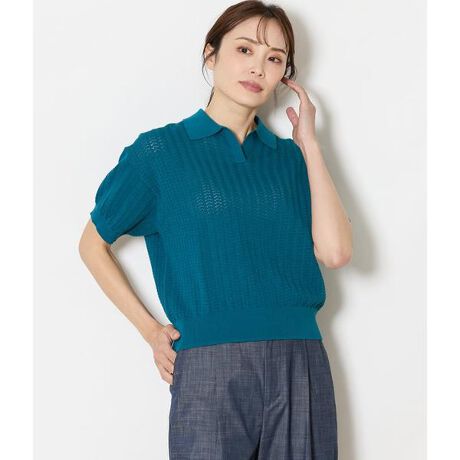 繊細な透かし柄が存在感を放つニットポロ。程よいシアー感が涼しげな印象を与え、シンプルながらも着映えする一枚に仕上げました。スキッパーデザインで顔まわりをすっきり見せ、ゆったりとしたサイズ感でリラックスした着心地。1枚で装いが整う、夏の着映えニットです。