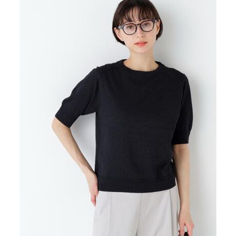 袖口や襟元にニットらしいアクセントを入れた半袖のニットTです。シルエットはシンプルですがニュアンスのある素材感でベーシックになりすぎず1枚で様になるプルオーバーです。