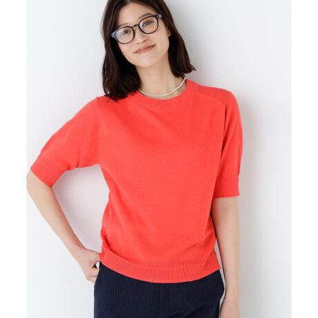 袖口や襟元にニットらしいアクセントを入れた半袖のニットTです。シルエットはシンプルですがニュアンスのある素材感でベーシックになりすぎず1枚で様になるプルオーバーです。