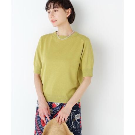 袖口や襟元にニットらしいアクセントを入れた半袖のニットTです。シルエットはシンプルですがニュアンスのある素材感でベーシックになりすぎず1枚で様になるプルオーバーです。
