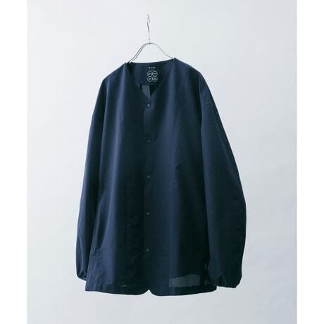 同素材で展開しているジャケットをベースに衿を排したノーカラーデザイン。ミニマルで軽やかな印象に仕上げています。