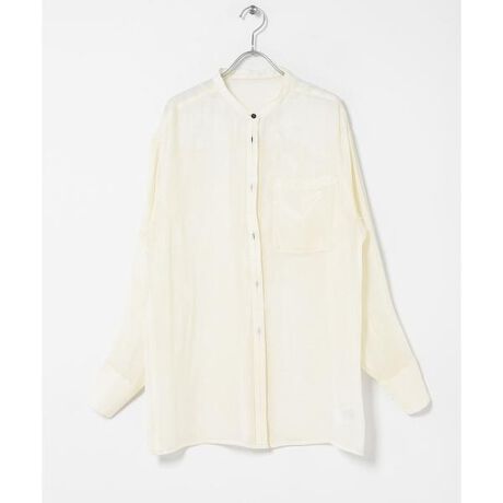 程よい光沢がポイントのバンドカラーシャツ。落ち感もあり華奢見えするシルエットにこだわりました。配色釦もアクセントになっており、身体のラインを拾い過ぎないサイジングもポイントです。