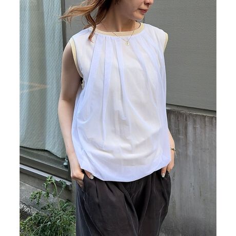 ノースリーブのシンプルなベースに、チュールを重ねたレイヤード風デザインがポイントです。1枚で着ても表情が出やすく、スタイリングにニュアンスを添えてくれます。すっきりとした襟ぐりとほどよいゆとりのあるシルエットで、合わせるボトムを選びにくいのも魅力です。オフホワイト、ライトブルー、チャコールグレーの3色展開です。