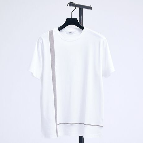 ブランド定番のライン系デザインをワイドなLラインでアレンジした半袖Tシャツ。ライン切り替えには凹凸感のあるワッフル組織を施し、異素材のコンビネーションデザインに仕上げています。