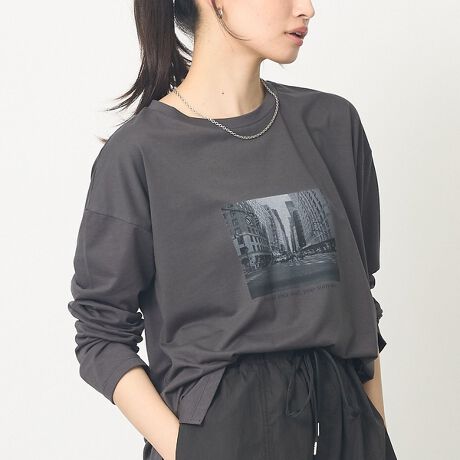 [型番:72529020015]フロントに施されたモノトーンのフォトプリントが目を惹く、主役になるロンT。ゆったりとしたドロップショルダーが程よいルーズさを出しつつ、少しキレイめな質感の素材にすることで、上品さも演出できるアイテムに。裾のサイドにカットがあるので、前だけインをしたときにもバランスよく決まります。【styling】一枚で着るのはもちろん、ジャケットやカーディガンのインナーとして着てフロントデザインを覗かせるコーデも◎