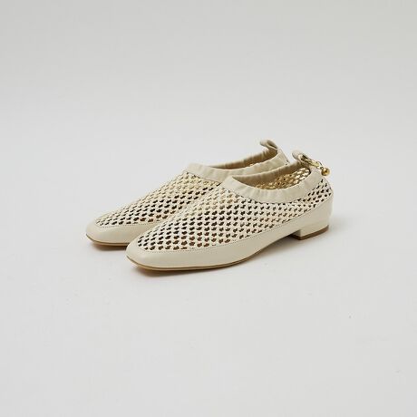トレンドのメッシュ素材を取り入れた、軽やかな印象のシューズ。透け感のあるアッパーが足元に抜け感をつくり、シンプルな装いにも映える一足です。すっきりとしたフォルムで、フラットでも女性らしい雰囲気に仕上がります。取り外し可能なカラビナチャーム付きで、お好みで好きな場所に付け替えてアレンジが楽しめるのも他にない魅力です。