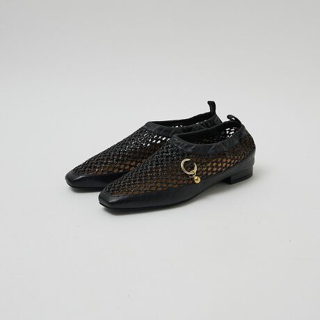 トレンドのメッシュ素材を取り入れた、軽やかな印象のシューズ。透け感のあるアッパーが足元に抜け感をつくり、シンプルな装いにも映える一足です。すっきりとしたフォルムで、フラットでも女性らしい雰囲気に仕上がります。取り外し可能なカラビナチャーム付きで、お好みで好きな場所に付け替えてアレンジが楽しめるのも他にない魅力です。