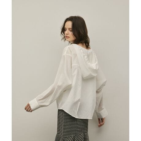[型番:0326241339]落ち感ある素材を使用したフード付きシャツ。首回りのデザインをフードになった事でゆるく優しい印象を与えるデザインシャツ。※こちらのモデル着用画像はサンプル品を撮影しております。実際の商品と仕様、加工、サイズが若干異なる場合がございます。予めご了承くださいませ。