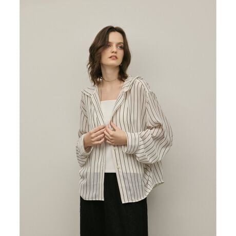 [型番:0326241339]落ち感ある素材を使用したフード付きシャツ。首回りのデザインをフードになった事でゆるく優しい印象を与えるデザインシャツ。※こちらのモデル着用画像はサンプル品を撮影しております。実際の商品と仕様、加工、サイズが若干異なる場合がございます。予めご了承くださいませ。