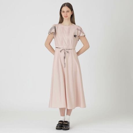 チュールをレイヤードしたスリーブが印象的な、きれいめドレスです。