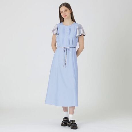 チュールをレイヤードしたスリーブが印象的な、きれいめドレスです。