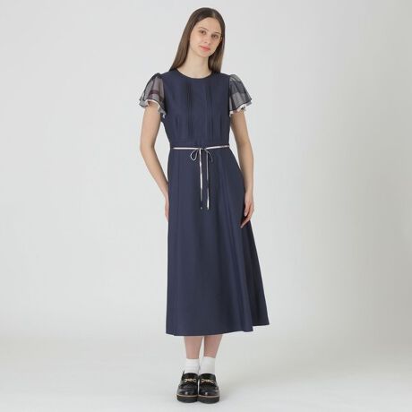 チュールをレイヤードしたスリーブが印象的な、きれいめドレスです。