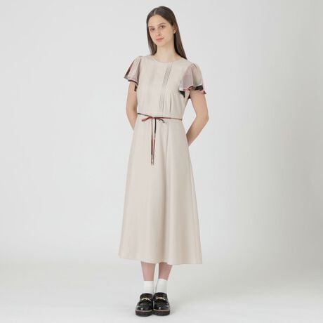 チュールをレイヤードしたスリーブが印象的な、きれいめドレスです。