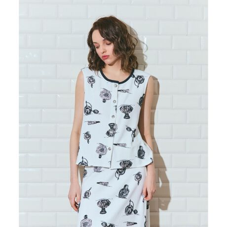 上質な綿100%のコンパクトパイルにオリジナルのパフューム柄をプリントしたバックペプラムのデザインのノースリーブ。