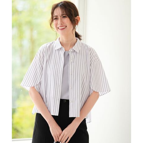 ・ペタルスリーブがポイントのシャツブラウス・広がりすぎないシルエットでより着こなしやすいデザイン・パンツに合わせやすい程よいクロップド丈で、トップスIN/OUT両方での着用が可能・ブルーストライプのみ別柄のストライプ4色展開で、全てにシルバーのラメ糸を使用・シルバーラメ糸を使用したストライプ柄とフロントのパール調ボタンが華やかな印象・トップス使いでも羽織りでも着用可能