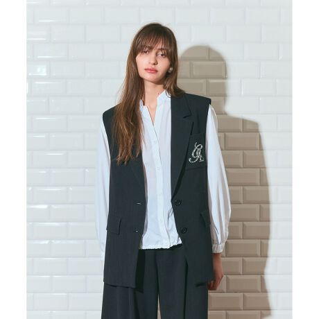 [型番:0226257024]【Japan Fabric】ほどよいシアー感とストレッチ性のある上品な夏素材を使用したテーラードジレ。胸ポケットにブランドロゴの金糸刺繍の上に、ビジュー手刺繍を入れたデザイン。同シリーズでお作りしたリネンタッチタックパンツ【品番:0226211024】のご用意もございます。※こちらのモデル着用画像はサンプル品を撮影しております。実際の商品と仕様、加工、サイズが若干異なる場合がございます。予めご了承くださいませ。