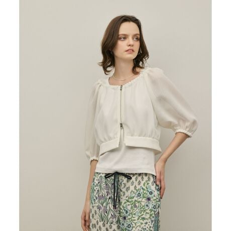 レース調のカラミ素材を使用したシアー感のあるジャケット。