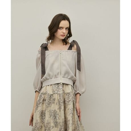 [型番:0126201113]レース調のカラミ素材を使用したシアー感のあるジャケット。オフショルダーとしても着用できる2wayデザインとなっております。※こちらのモデル着用画像はサンプル品を撮影しております。実際の商品と仕様、加工、サイズが若干異なる場合がございます。予めご了承くださいませ。