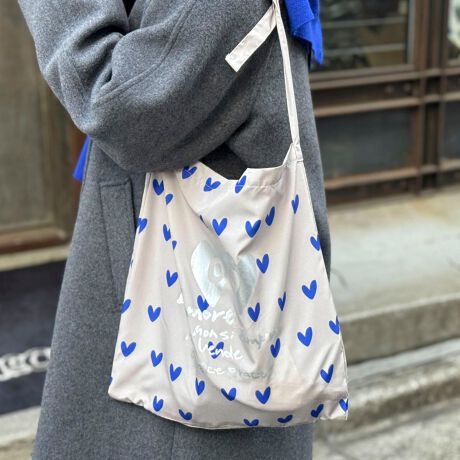・全体に小ぶりなハートが配置され、中央のゴールドプリントがポイントに。