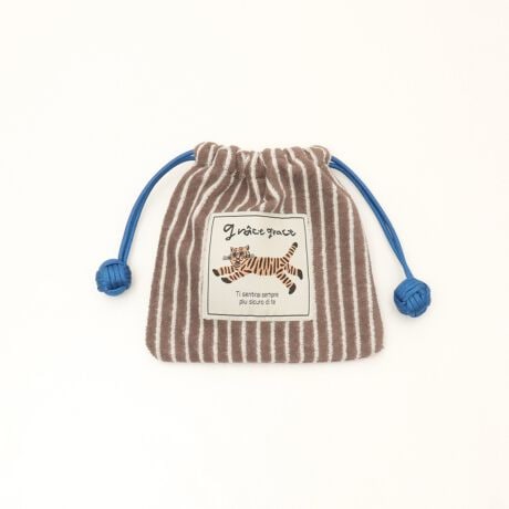 ・ブラウン・パープル・ピンクのポップなストライプ柄で、それぞれ配色になっている巾着紐もポイント