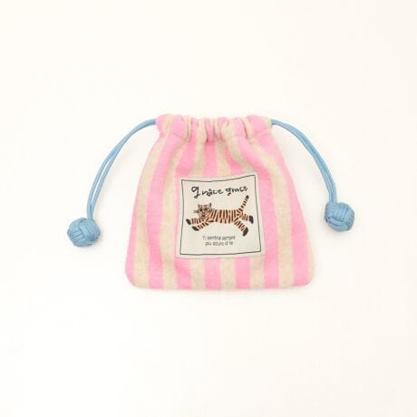 ・ブラウン・パープル・ピンクのポップなストライプ柄で、それぞれ配色になっている巾着紐もポイント