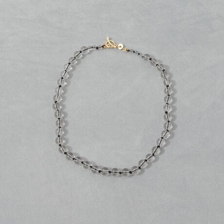 ・デザインのポイントは、天然石を繋ぐカラーヤーン。クリアな天然石にブラックヤーンがクールな印象に。