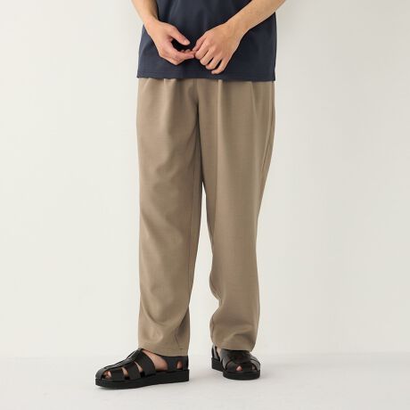 イージーケア性も魅力の合繊素材を使用したワイドパンツ。