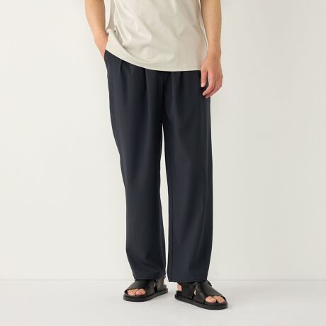 イージーケア性も魅力の合繊素材を使用したワイドパンツ。