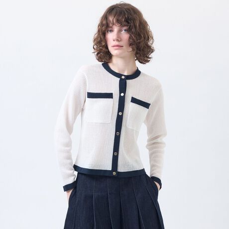 すっきりとしたボックスシルエットとノーカラーデザインが人気のROYTON(ロイトン)シリーズを、シアーなワッフルテキスタイルで仕上げたニットカーディガンです。