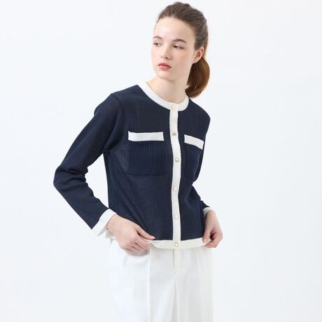 すっきりとしたボックスシルエットとノーカラーデザインが人気のROYTON(ロイトン)シリーズを、シアーなワッフルテキスタイルで仕上げたニットカーディガンです。