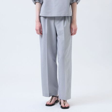 様々なトップスに好相性のタックパンツ。きれいめなワイドストレートシルエットで、肌離れの良い清涼感のあるサッカー素材で仕立てました。