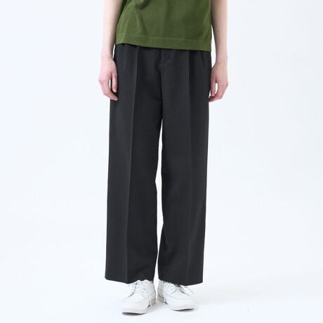 様々なトップスに好相性のタックパンツ。きれいめなワイドストレートシルエットで、肌離れの良い清涼感のあるサッカー素材で仕立てました。