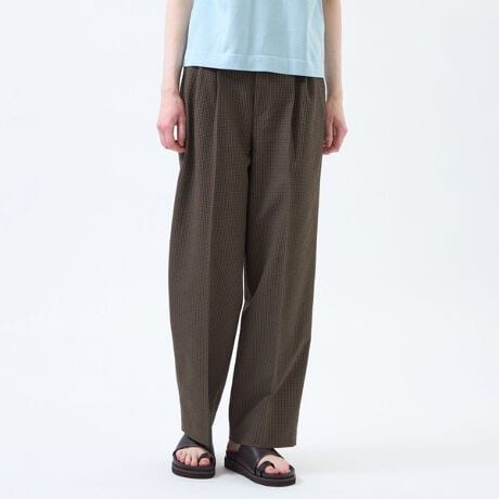 様々なトップスに好相性のタックパンツ。きれいめなワイドストレートシルエットで、肌離れの良い清涼感のあるサッカー素材で仕立てました。