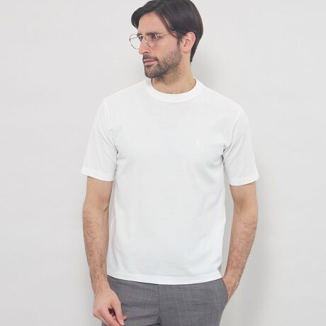 ブライトンポロと同じハニカム素材を使用した衿リブTシャツです。衿リブを表地と同じ糸でしっかりと厚みを持たせて編み立てており、通常のTシャツよりも上品な佇まいに仕上げています。肌離れの良い軽やかな素材でありながら、きれい目に着れる他にはない大人のTシャツです。
